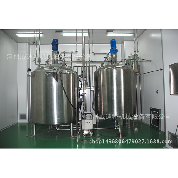 调配罐结构:该装置分为缸体,缸盖,搅拌桨,进料口和排气阀。全部由进口不锈钢1Cr18Ni9Ti制成,并根据GB741-80的技术要求进行。缸体抛光,内部抛光。有用于搅拌的搅拌桨。顶部是摆线针轮行星减速器,该行星减速器驱动搅拌桨,该搅拌桨可以组装,拆卸和清洁。有两个可打开的气缸盖用于清洁。圆柱体的底部倾斜,便于排空。它连接到其他两个进料口和管线,以促进各种组件的连续供应。下方有一个排出口,可以安装旋塞阀。均匀混合后,将旋塞阀的手柄旋转90度以排放物料,并在排放完成后关闭物料以实现均匀混合。目的。